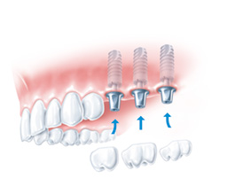 - Drei Zähne fehlen: Eine Brücke über zwei Zahnimplantate erspart herausnehmbaren Zahnersatz.